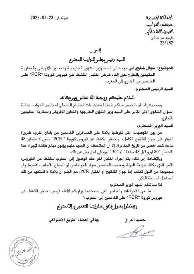 نشر ،حميد الدراق،نائب برلماني،عن دائرة تطوان،تدوينة على صفحته بالفايسبوك حيث كتب “كنت من السباقين لإثارة موضوع PCR ، في سؤال شفوي وجهته الى السيد وزير الشؤون الخارجية والتعاون الإفريقي والمغاربة المقيمين بالخارج .