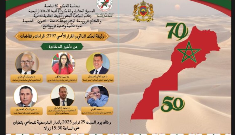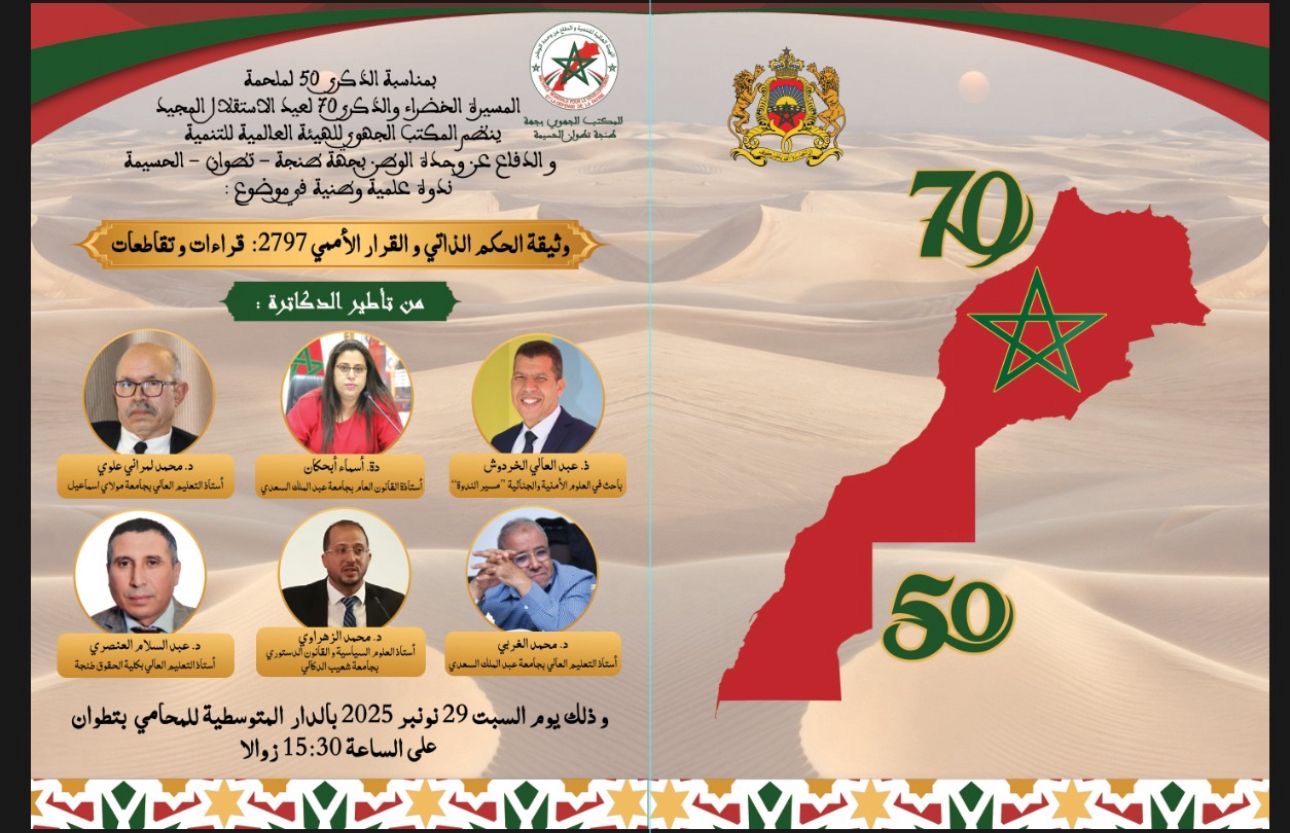 يستعد المكتب الجهوي للهيئة العالمية للتنمية والدفاع عن وحدة الوطن بجهة طنجة–تطوان–الحسيمة لتنظيم ندوة علمية كبرى تحمل عنوان “وثيقة الحكم الذاتي والقرار الأممي 2797: قراءات وتقاطعات”، وذلك في إطار مواصلة جهوده التعريفية والدفاعية حول القضية الوطنية الأولى.